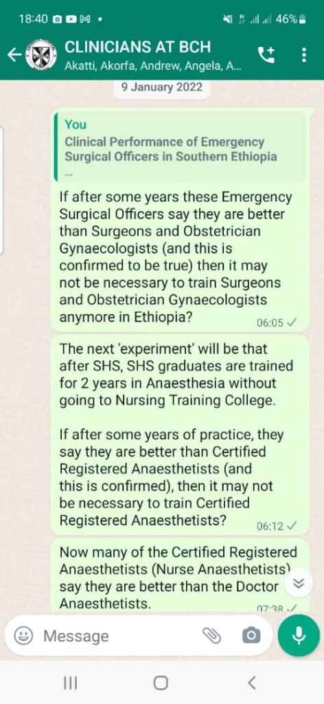 If after some years these Emergency Surgical Officers say they are better than Surgeons and Obstetrician Gynaecologists (and this is confirmed to be true) then it may not be necessary to train Surgeons and Obstetrician Gynaecologists anymore in Ethiopia?