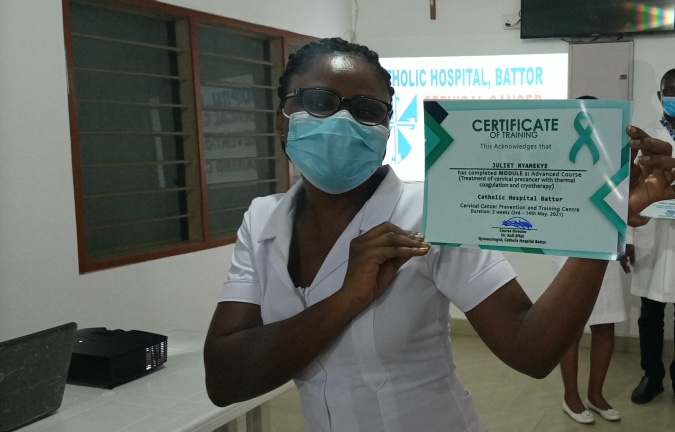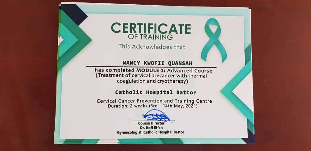 Our 12 trainees from 12 institutions in 7 out of the 16 Regions of Ghana, completed Module 2 of our training programme and are now equipped to follow up screen positives with basic colposcopy (using a mobile colposcope) and to treat precancerous lesions of the cervix with thermal coagulation and cryotherapy.